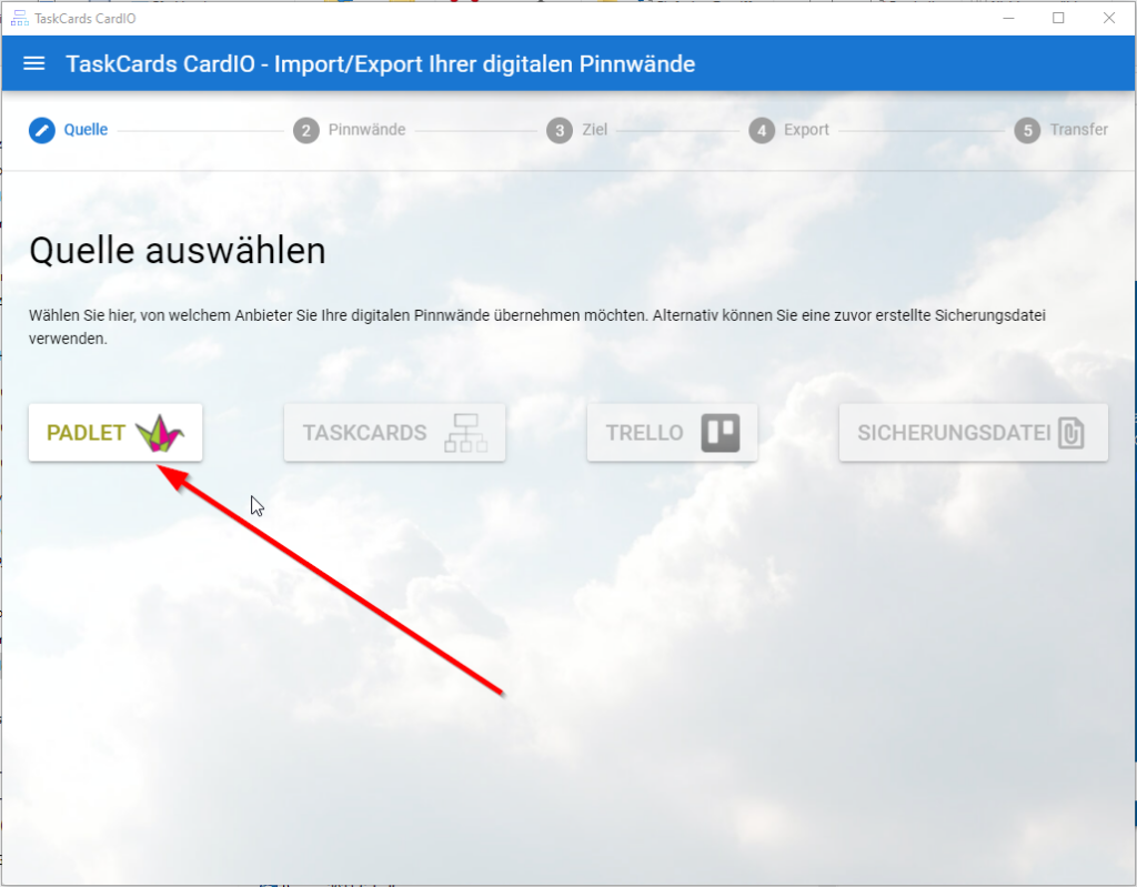 3. Ziel: Taskcards auswählen und danach einloggen. Dabei den Haken bei „Anmeldung bei Organisationsinstanz“ setzen und darunter „kroetensee.taskcards.app“ eingeben. Danach die eigenen Zugangsdaten eintragen und „Jetzt anmelden“ anklicken. Ein Klick auf „WEITER“ bringt nochmal eine Übersicht über die ausgewählten padlets. „TRANSFER STARTEN“ überträgt die Padlets zu Taskcards. Der erfolgreiche Transfer wird bestätigt.